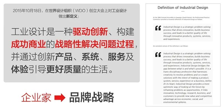 就当今世界对设计价值认知的进化过程来看,BDD是2011—2020年期间才在全球成功企业的发展中凸显出来,也是设计产业自身以及商业社会对设计价值、系统设计逻辑维度边界的认知突破而来。 这场变革的路径可从“什么是设计?”的解答中洞悉。通常,“设计概论”的任课教师都会在第一堂课上对学生说:设计是为了解决问题。但若有学生追问:设计能解决什么问题?答案则会是五花八门。回看数十年的设计发展,对此问题的定义解答是在不断迭代中呈现着认知系统的变革。我们可用世界设计组织对影响社会和经济发展最大的设计专业“工业设计”所做的三次定义来探究: 1980年,世界工业设计协会联合会(ICSID)给工业设计做出了权威定义。(图5左)红色字标出的5个关键词:材料、结构、形态、色彩、表面加工定义了这个专业的属性。将其代入今天的“工业设计师”工作场景,会发现:没错!这就是绝大多数工业设计师的职责所在,所设计的是物理属性的“硬件产品”要素。 2005年,ICSID在2005年又为“工业设计”做了新定义。(图5右)同样用红色字标出的4个关键词是:物品、流程、服务、系统,而且首次出现了“系统”。当把两次定义的关键词做比较,会发现25年前的定义被浓缩成了一个词——物品,而由系统设计观念来看,流程、服务、系统则呈现了由物理维度向逻辑维度的扩展与升级!