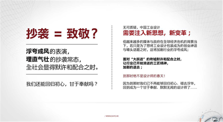 国内至今没有多少设计机构,具备成功进行企业化发展的经验,并可按照现代企业的运营模式运作;若要振兴我们的工业设计行业,使之能够与广告业、软件业、游戏业、音乐业、电影业能并驾齐驱的创意焦点产业,所有的工业设计人任重而道远……